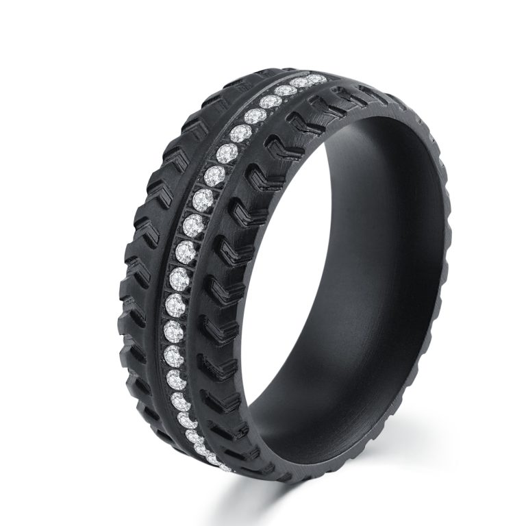 Tire Pattern Brushed finish 316L Stainless Steel Ring With Black IP Plated and White CZs CNC Inlaid