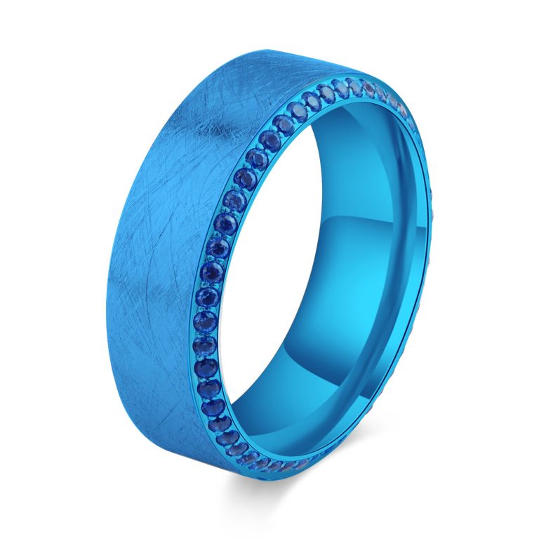 Handmade Brushed Finish 316L Stainless Steel Ring with Blue CZs CNC inlaid & Blue IP Plated