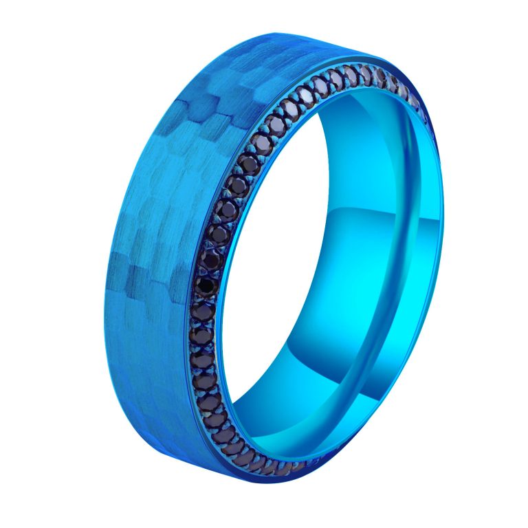 Hammered Blue IP Plated 316L Stainless Steel Brushed Finish Ring with Black CZs CNC Inlaid