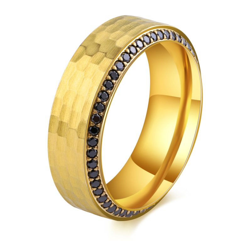 Hammered Yellow gold IP Plated 316L Stainless Steel Brushed Finish Ring with Black CZs CNC Inlaid