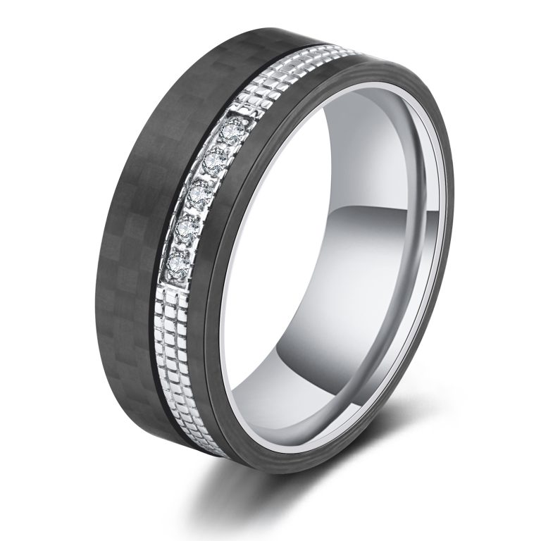316L Stainless Steel & Solid Carbon Fiber Ring with Black IP Plated and 5pcs White Stones CNC inlaid