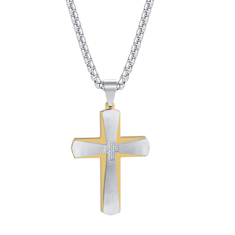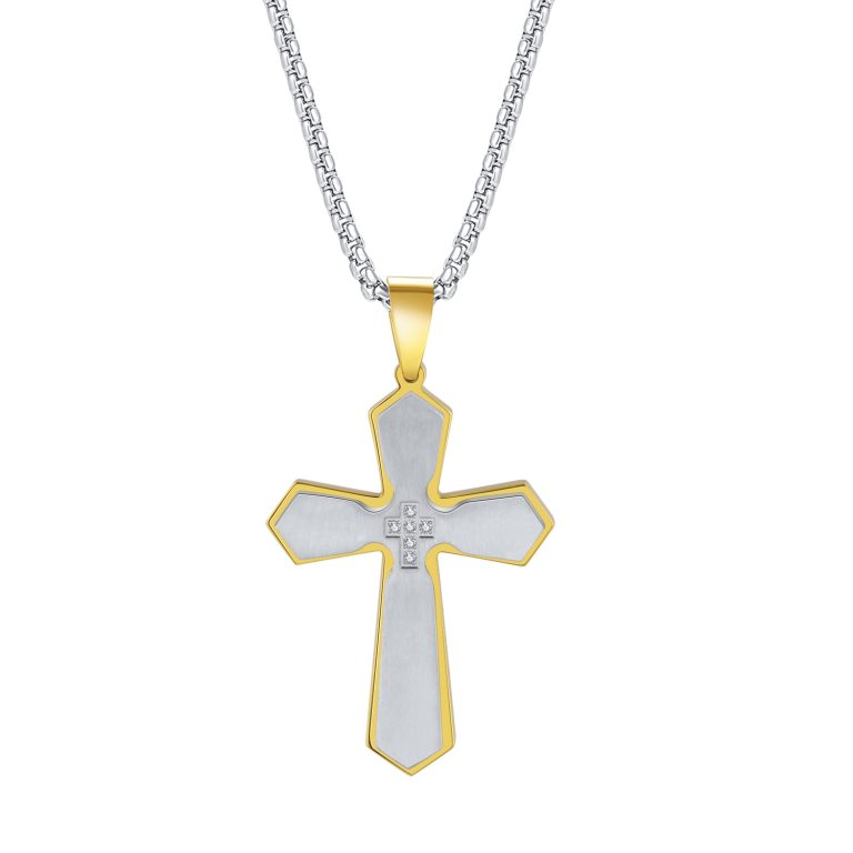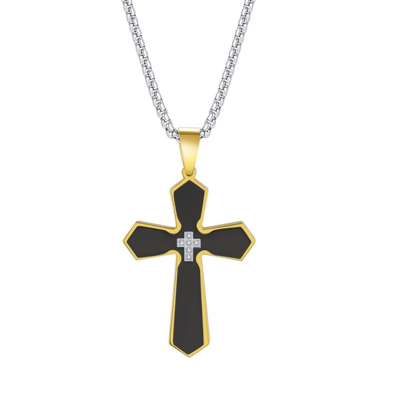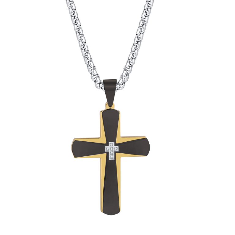 Gold & Black IP Plated 316L Stainless Steel Brushed Finish Cross Pendant with White CZ inlaid