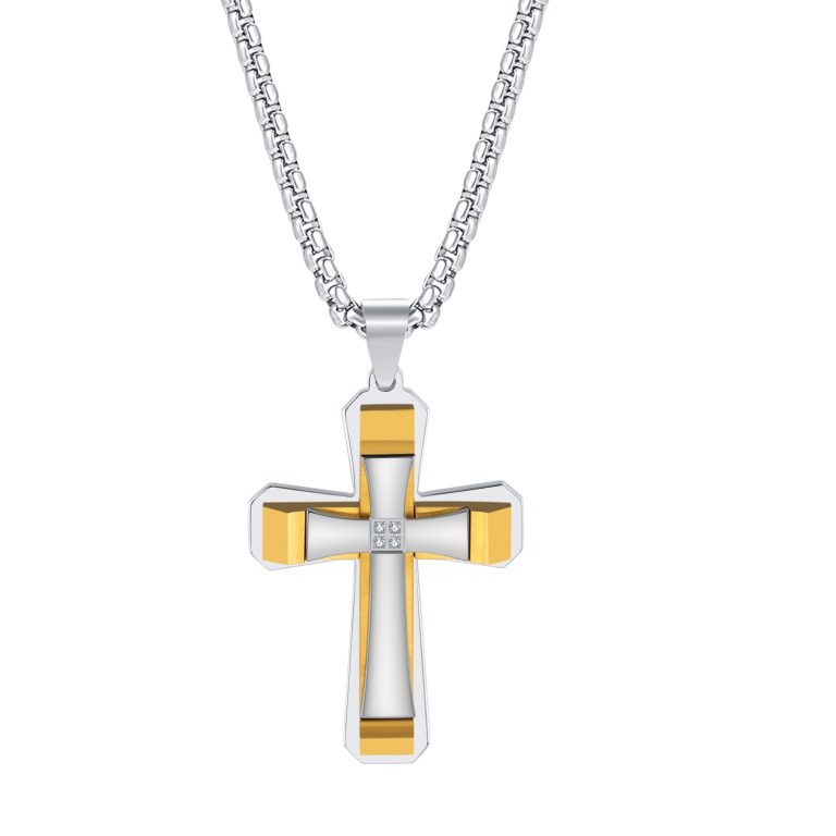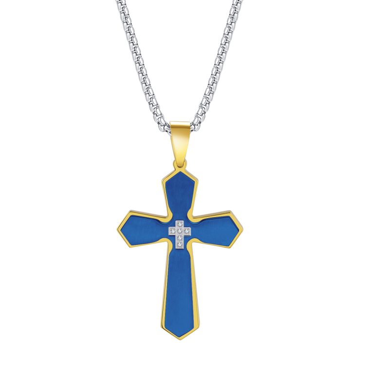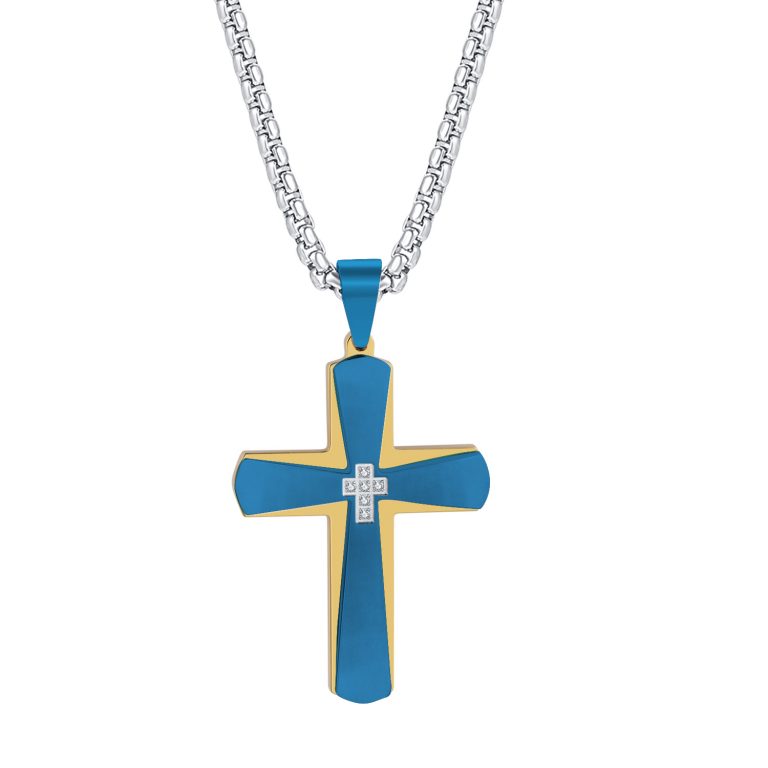 Gold & Blue IP Plated 316L Stainless Steel Brushed Finish Cross Pendant with White CZ inlaid
