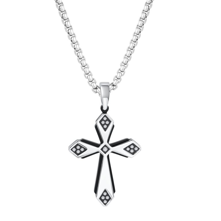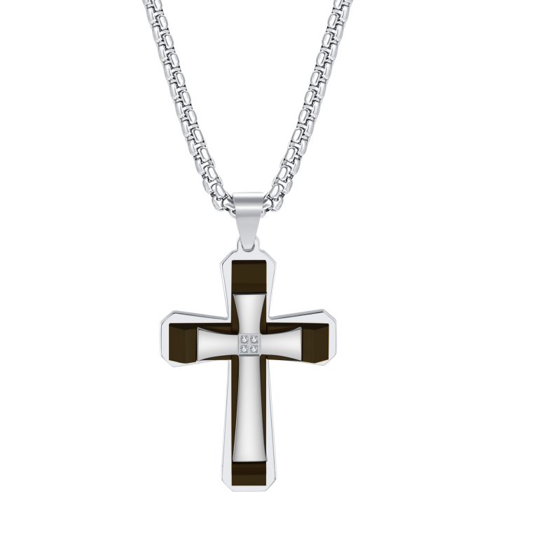 Carbon Fiber Inlaid Black IP Plated 316L Stainless Steel Cross Pendant With Round Box Chain