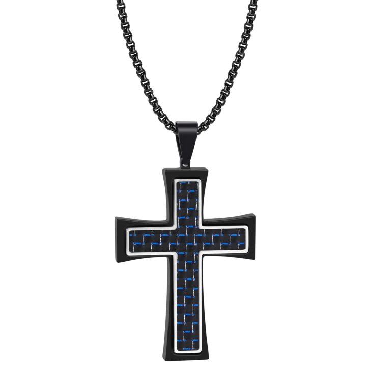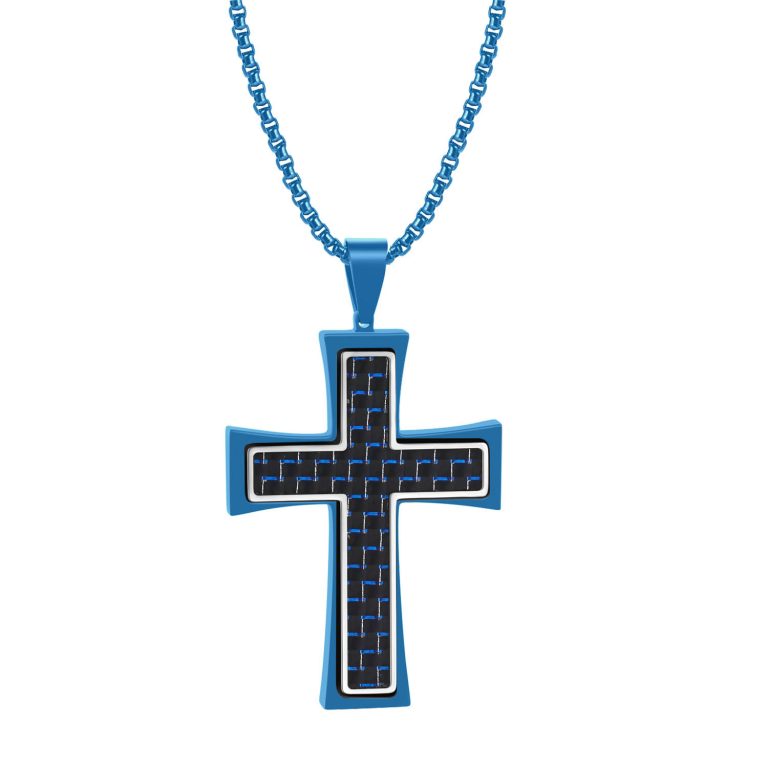 Carbon Fiber Inlaid Blue IP Plated 316L Stainless Steel Cross Pendant With Round Box Chain