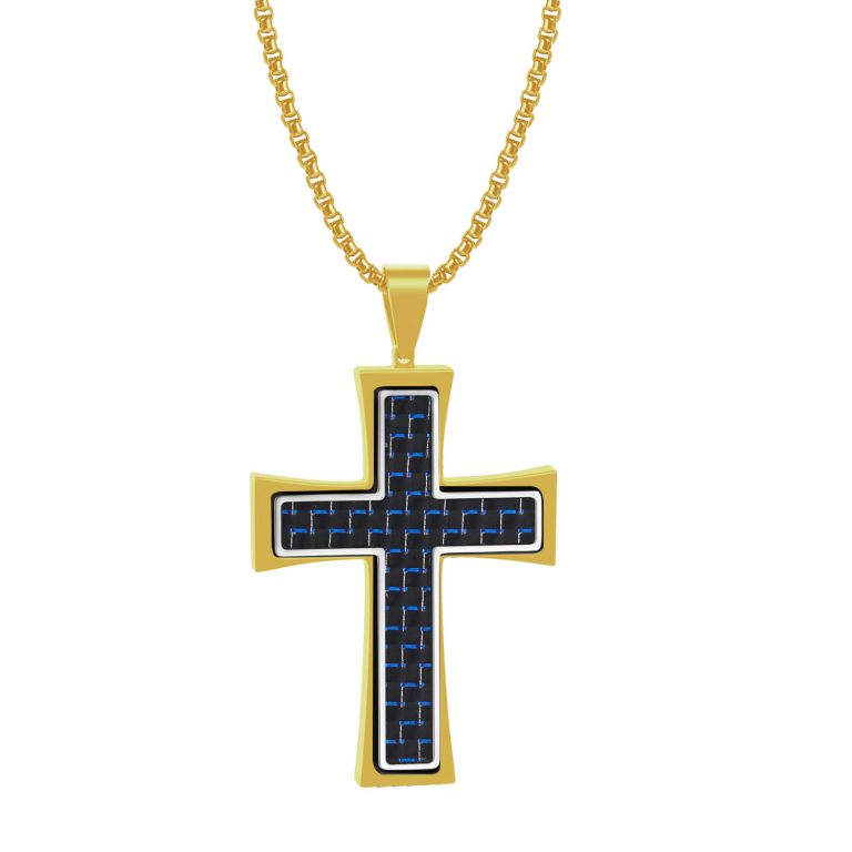 Carbon Fiber Inlaid Gold IP Plated 316L Stainless Steel Cross Pendant With Round Box Chain