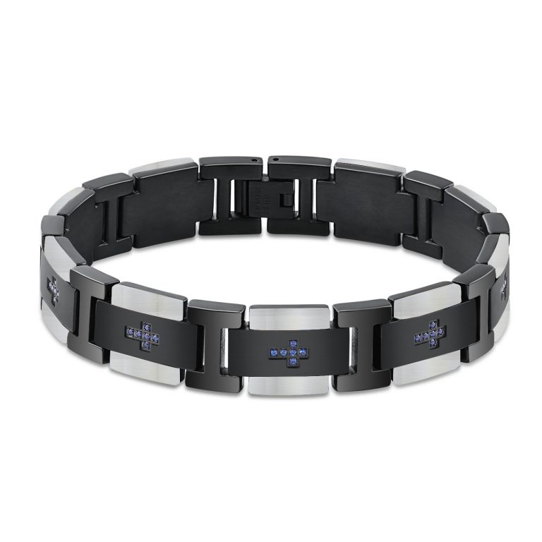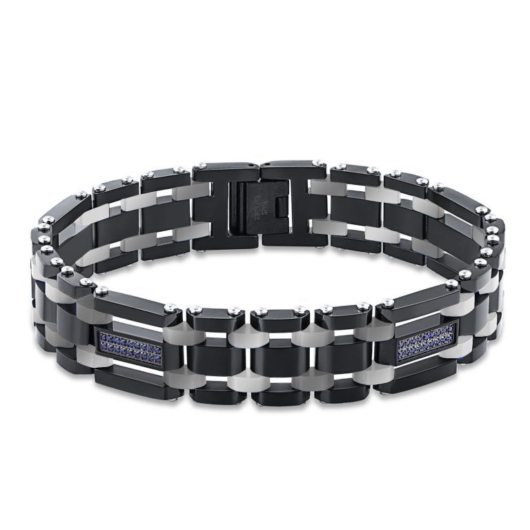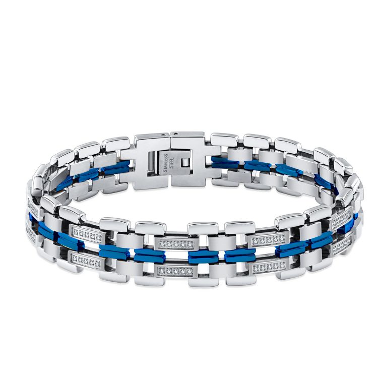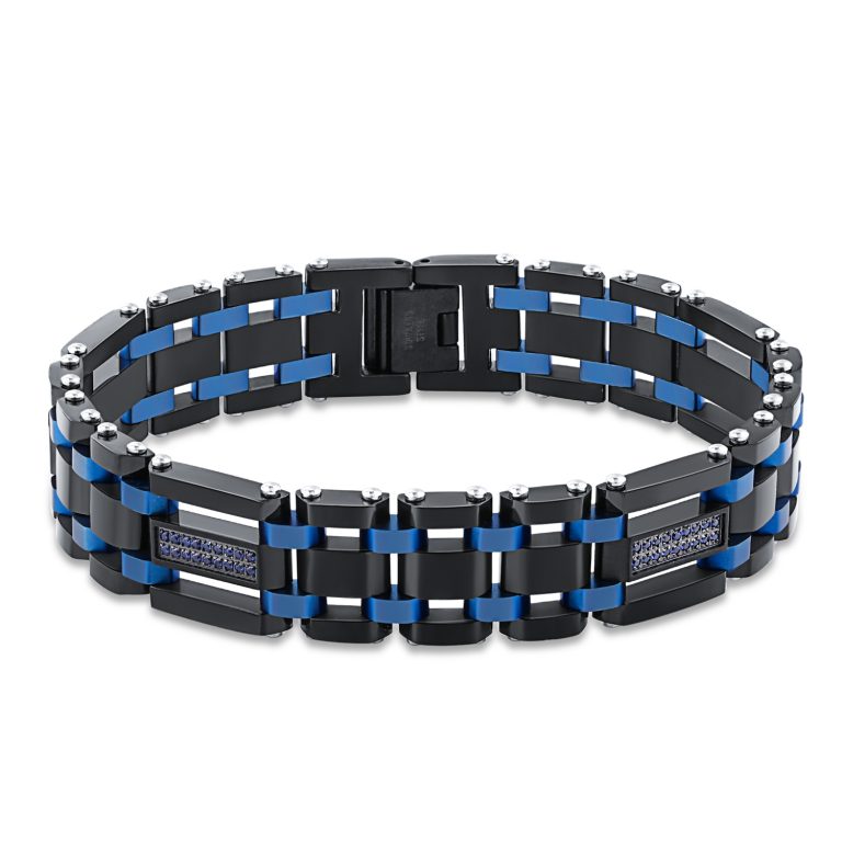 Men’s 316L Stainless Steel Brushed Finish Black & Blue Plated Links Bracelet With White CZ