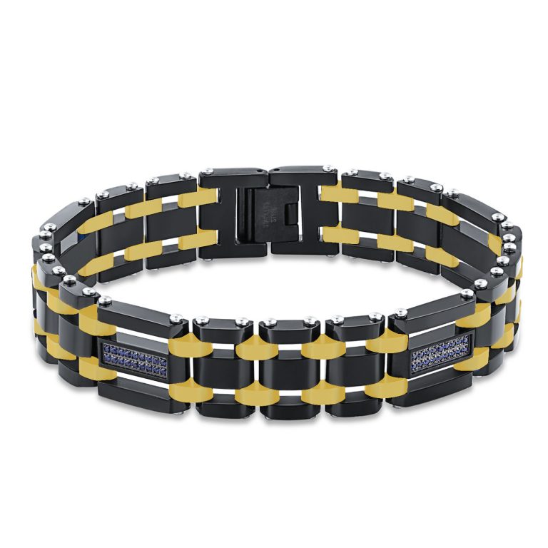 Men’s 316L Stainless Steel Polished Finish Black & Gold Plated Links Bracelet With Blue CZ