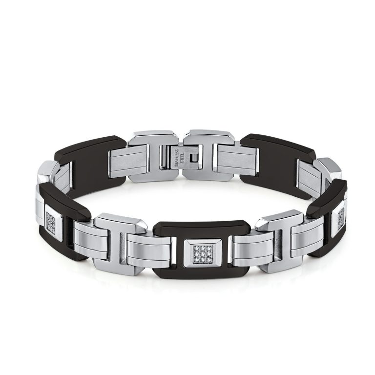 Men’s 316L Stainless Steel Brushed Finish Black Plated Links Bracelet With White CZ