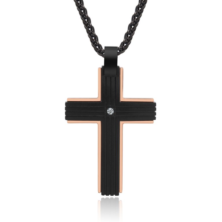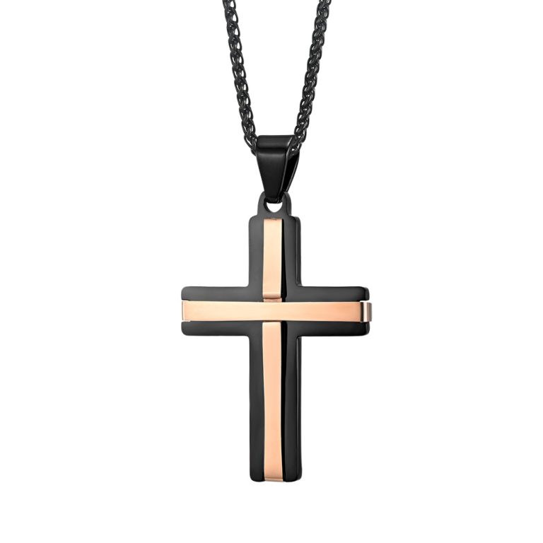 316L Stainless Steel Cross Pendant with Black & Rose Gold Plated Black Wheat Chain