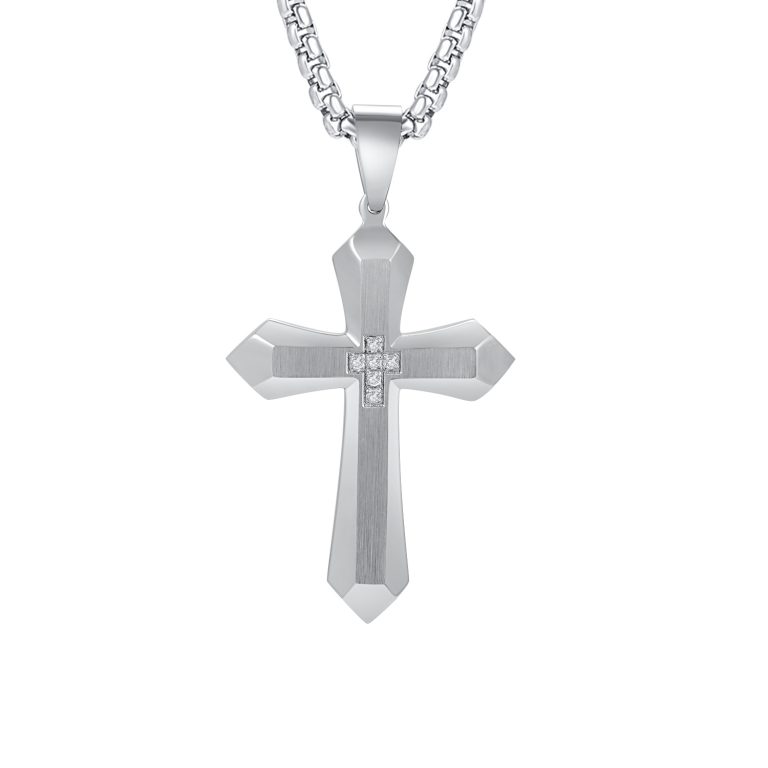 316L Stainless Steel High-end Bevel Edge Cross Pendant With Clear CZ & Box Chain