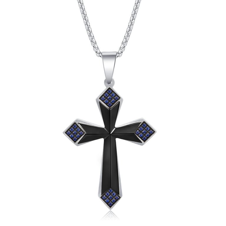 316L Stainless Steel High-end Cross Pendant Black Plated With Blue CZ & Box Chain