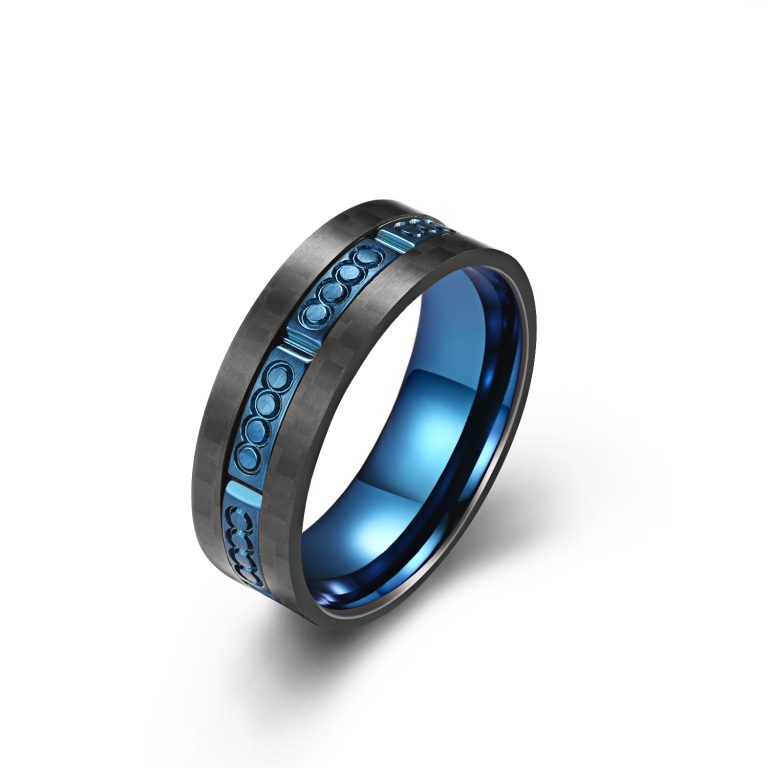 Blue/Black IP Plated Stainless Steel Lines & Solid Carbon Fiber Hammered Ring