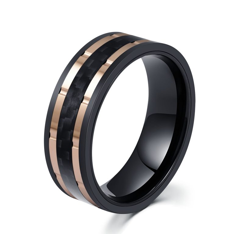 Rose gold/Black IP Plated Stainless Steel Lines & Solid Carbon Fiber Hammered Ring