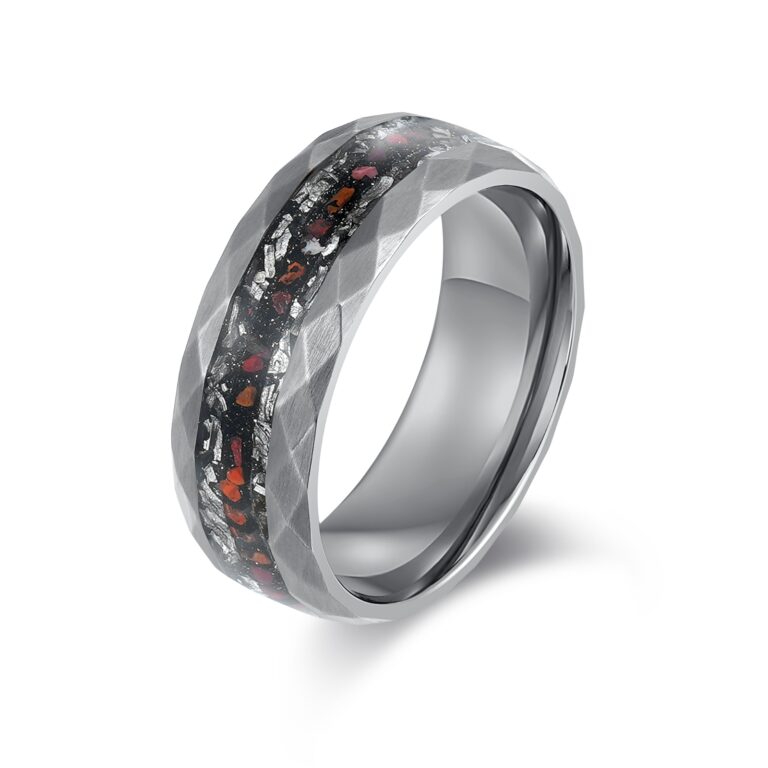Hammered S.ST ring with red dino bone & meteorite inlay, as pic