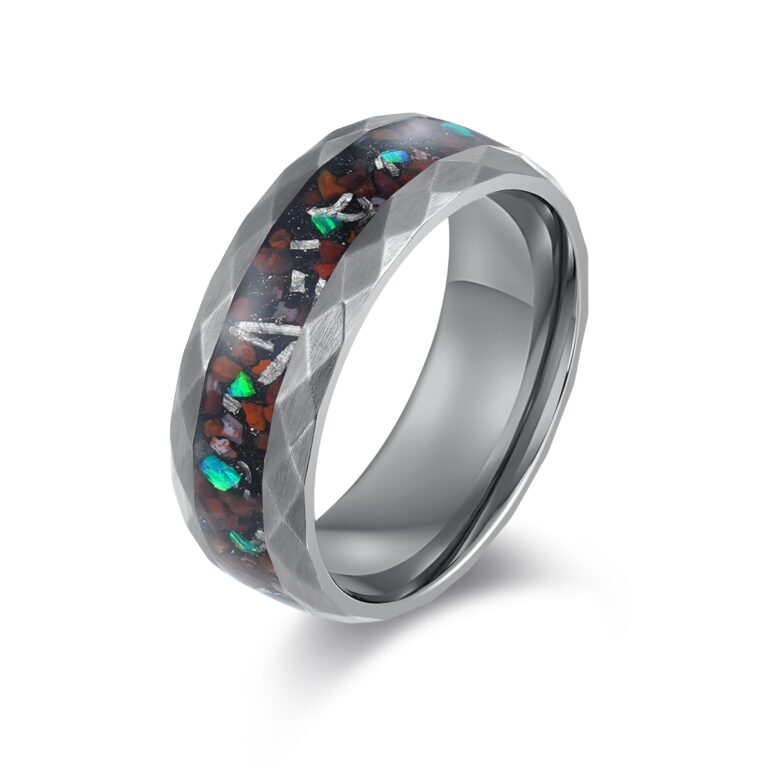 Hammered S.ST ring with red dino bone & opal, meteorite inlay, as pic