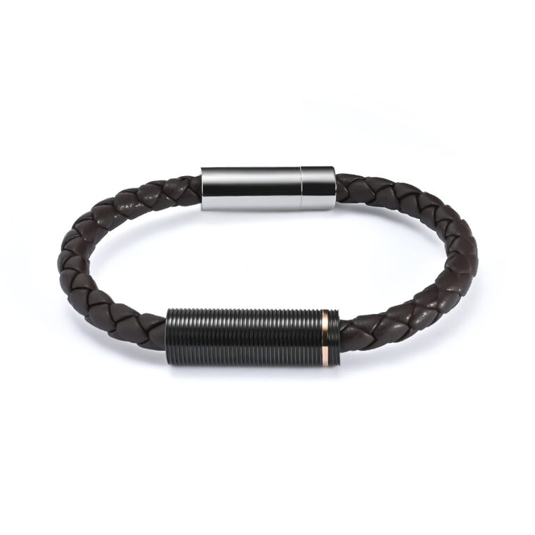Men’s Woven Black Leather and Stainless Steel Spinning element in IP Black and Rose Gold, with Steel magnetic clasp