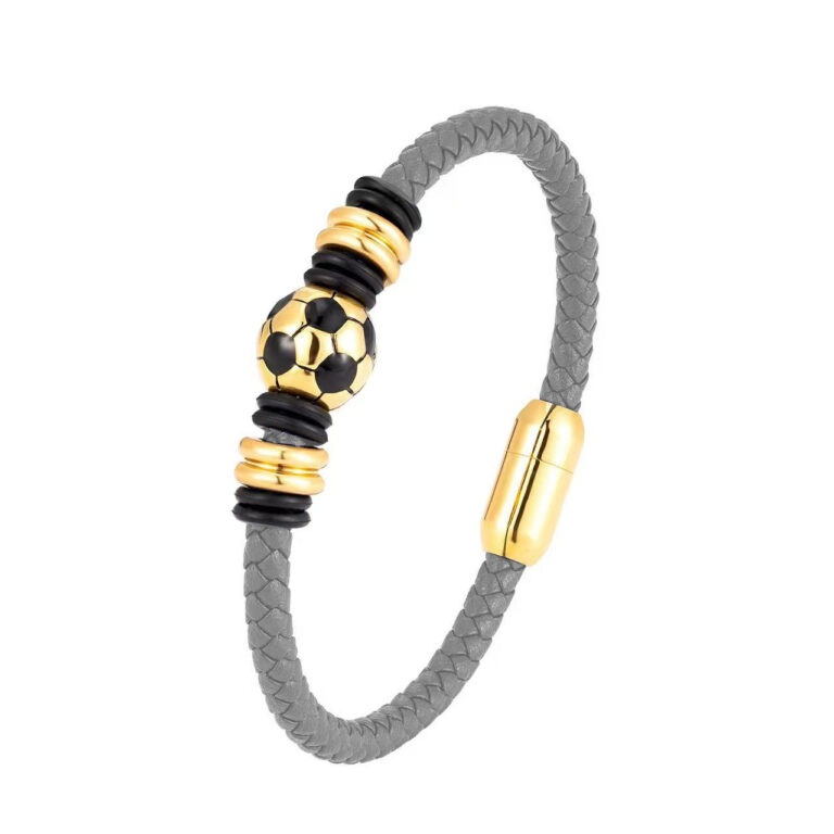 Men’s Stainless Steel Leather Bracelet Sports Style World Cup Soccer in Yellow Gold with Woven Leather Rope Bangle with magnetic clasp available in Black/Blue/Gray/Red leather colors