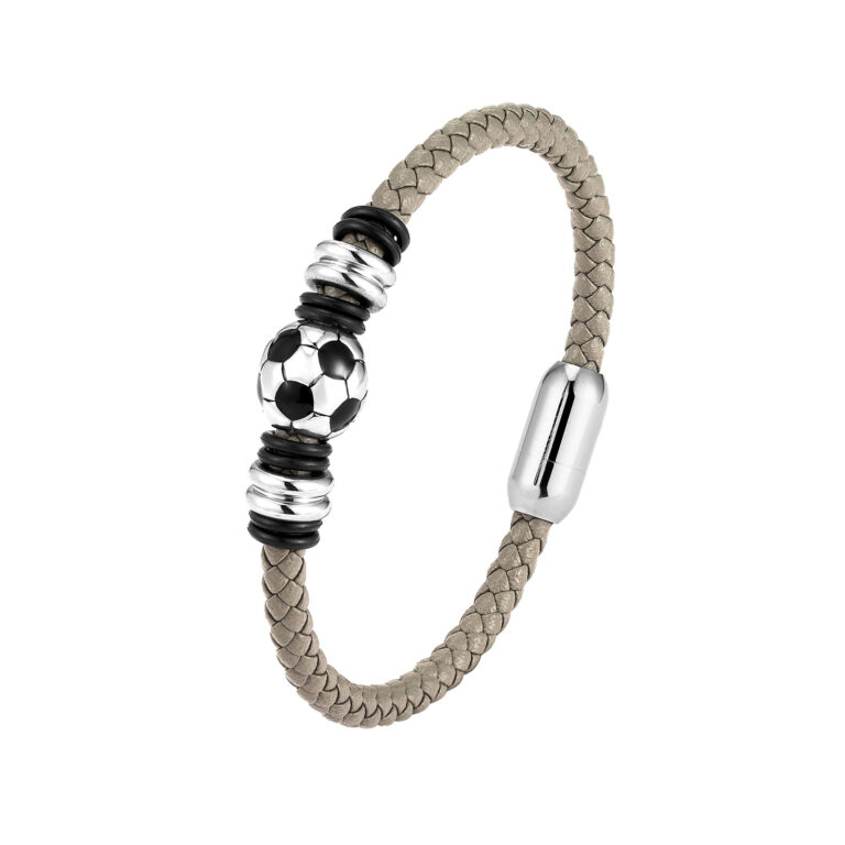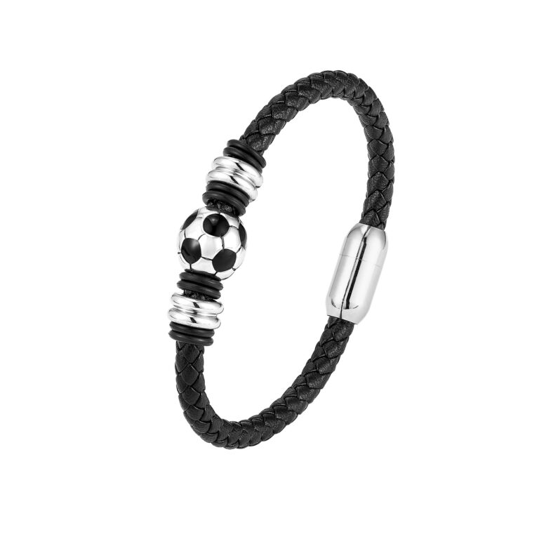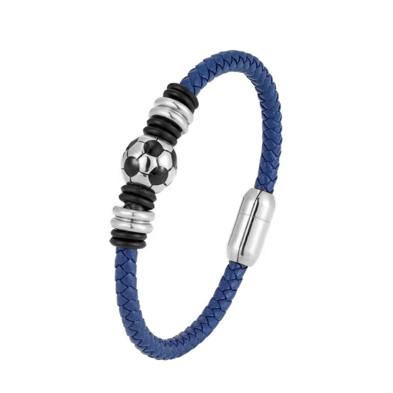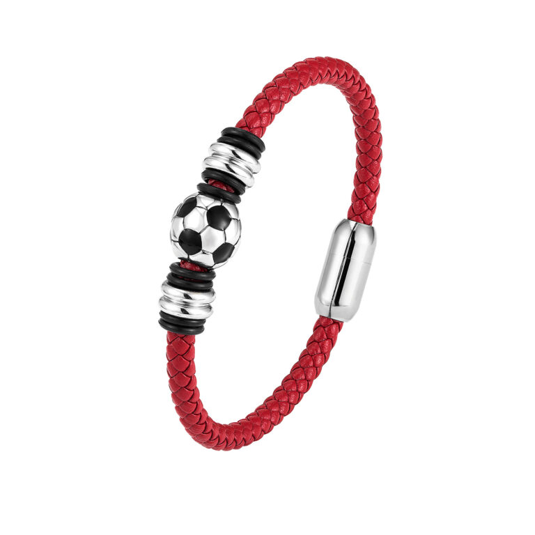 Men’s Stainless Steel Leather Bracelet Sports Style World Cup Soccer Woven Leather Rope Bangle with magnetic clasp available in Black/Blue/Gray/Red leather colors