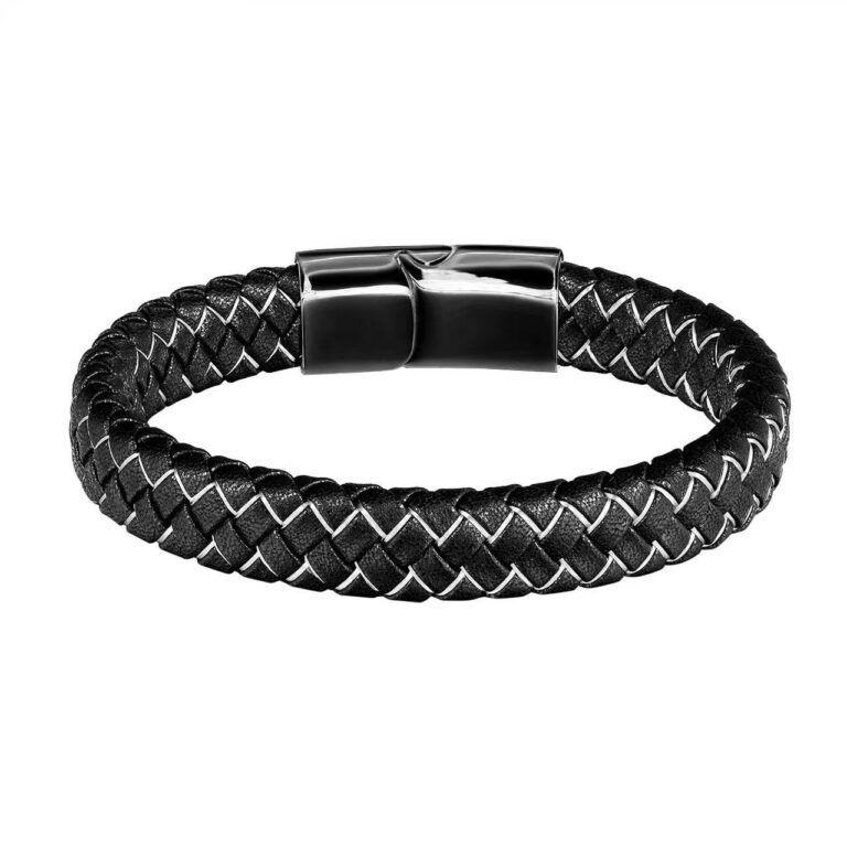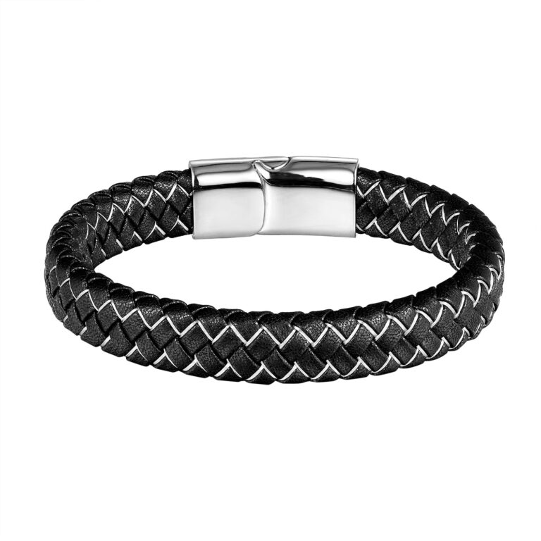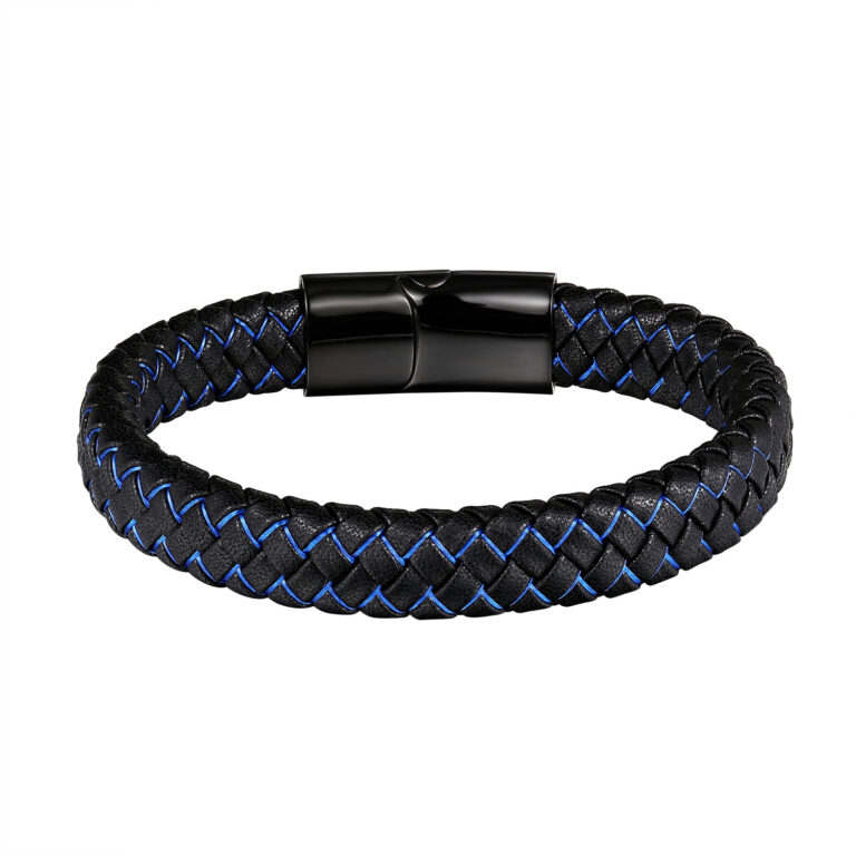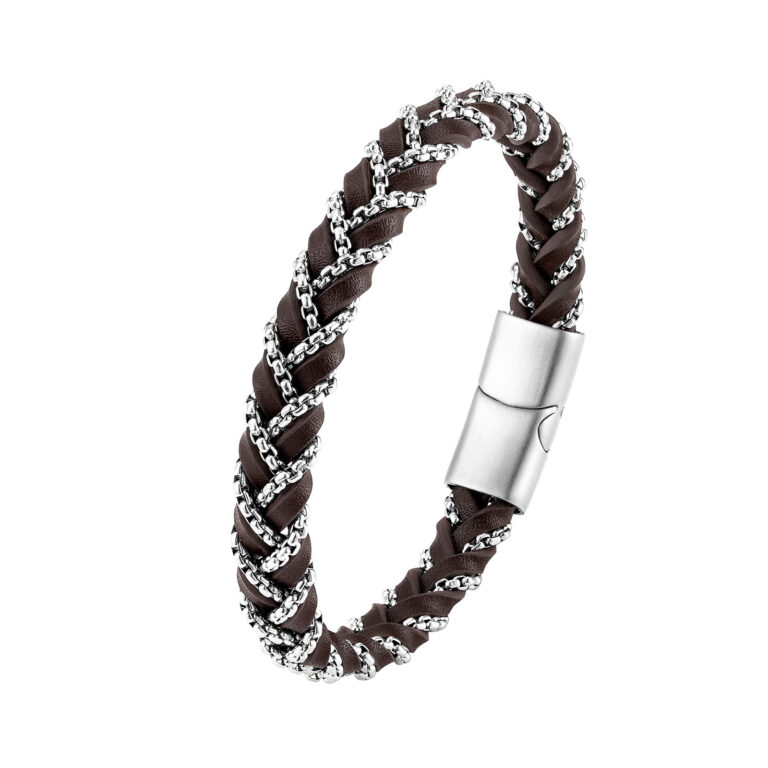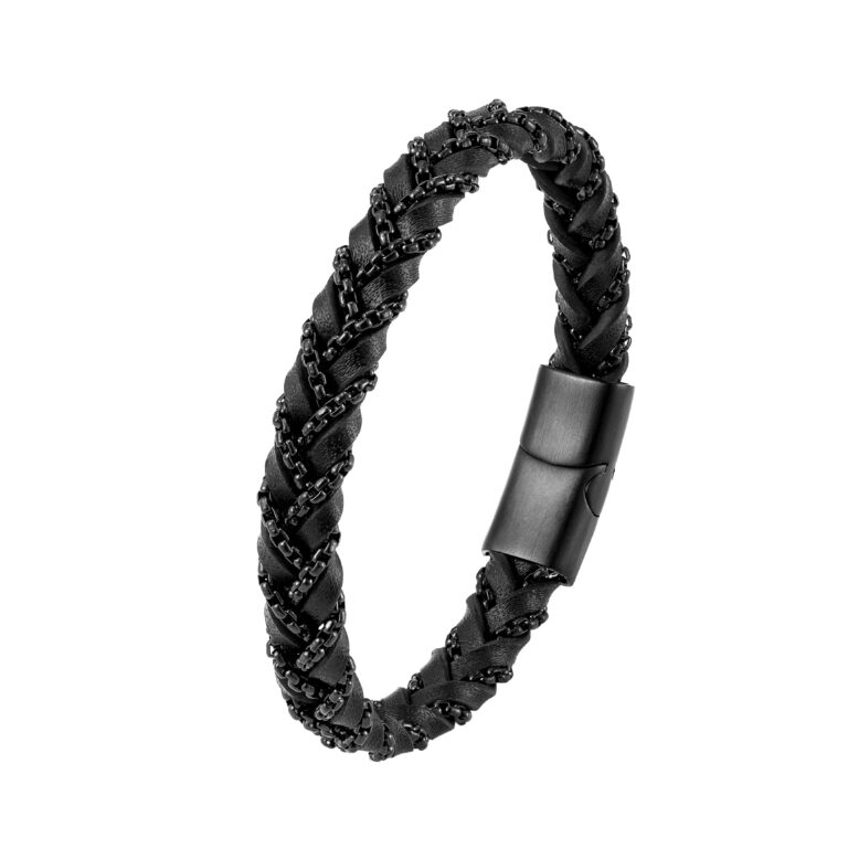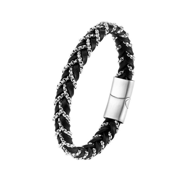 Men’s Stainless Steel Chain Woven in Leather Woven bracelet bangle with magnetic clasp, available in Steel/Black/Gold plating colors and Black/Blue/Brown/Red Leather colors