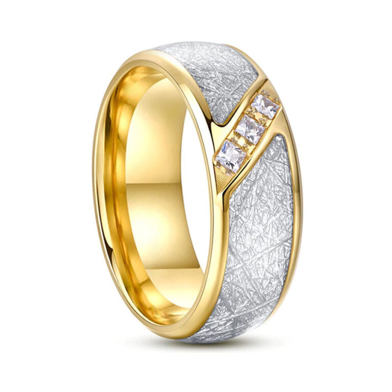 Men’s Polished Stainless Steel ring with 3 white CZs and wire inlay in IP Yellow Gold