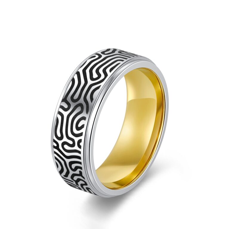 Men’s Polished Stainless Steel wedding ring/band with fingerprint pattern, in IP Yellow Gold