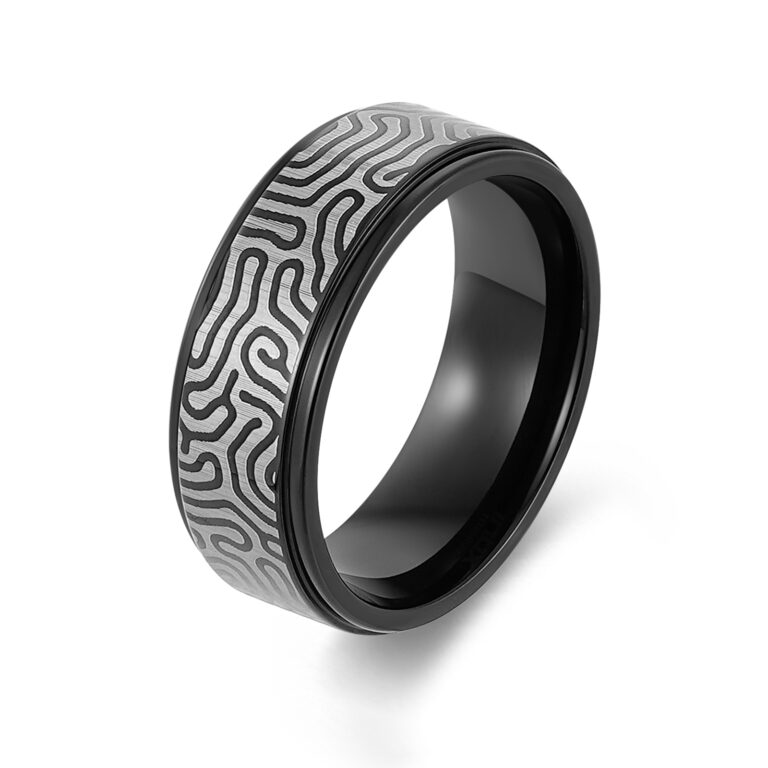 8mm-Tungsten/S.st/Titanium Polished ring with fingerprint pattern in IP Black