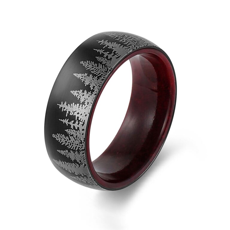 Men’s Polished Stainless Steel wedding ring/band with Forest Skyline, available in Steel/Black/Gold colors