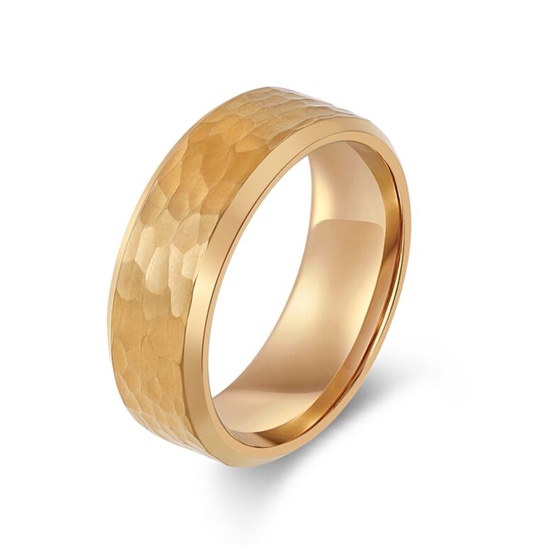 Men’s Hammered Stainless Steel wedding ring/band with beveled edges in Rose Gold IP