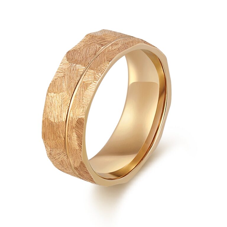 Men’s Hammered and Brushed Stainless Steel wedding ring/band with groove in Rose Gold IP