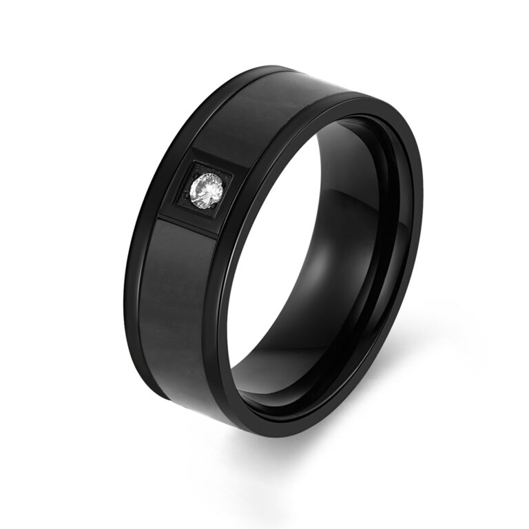 Men’s Polished Stainless Steel wedding ring/band in Black IP with center white CZ