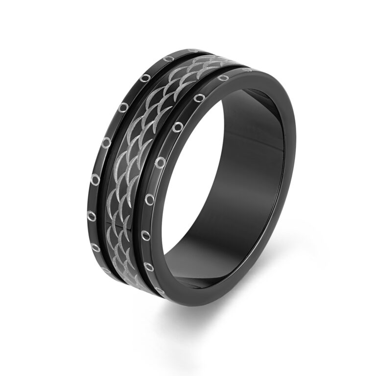 Men’s Polished Stainless Steel wedding ring/band with etched scales pattern in IP Black