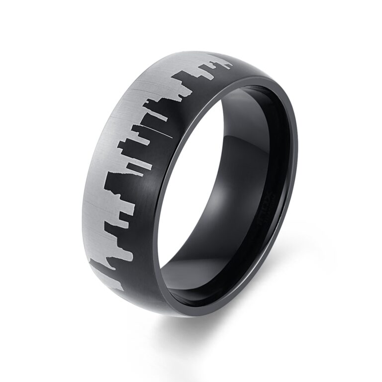 Men’s Polished Stainless Steel wedding ring/band with etched city skyline pattern in IP Black