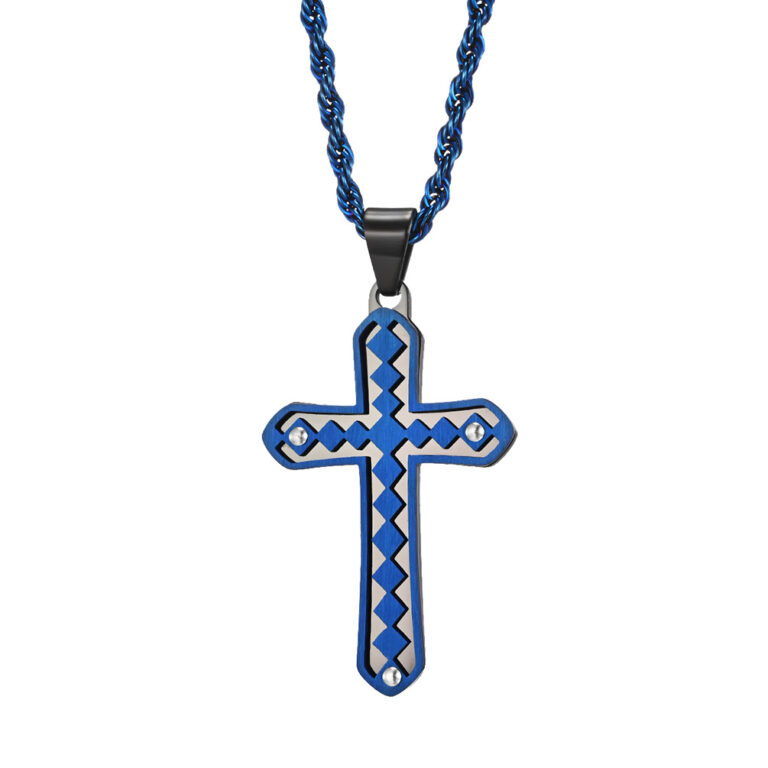 Men’s Stainless Steel Tire Pattern Cross Pendant in IP Black/Blue colors