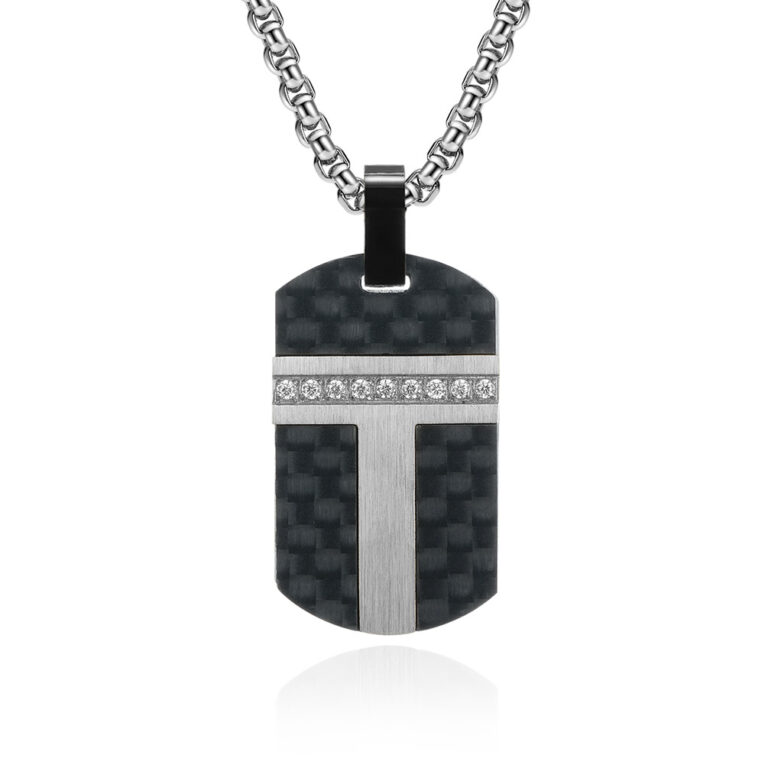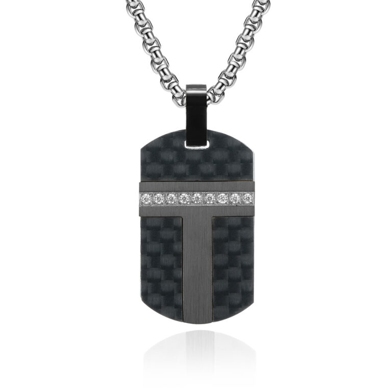 Men’s 316 Stainless steel solid carbon fiber combination dog tag pendant with CZ stones in Steel/Gold/Gunmetal