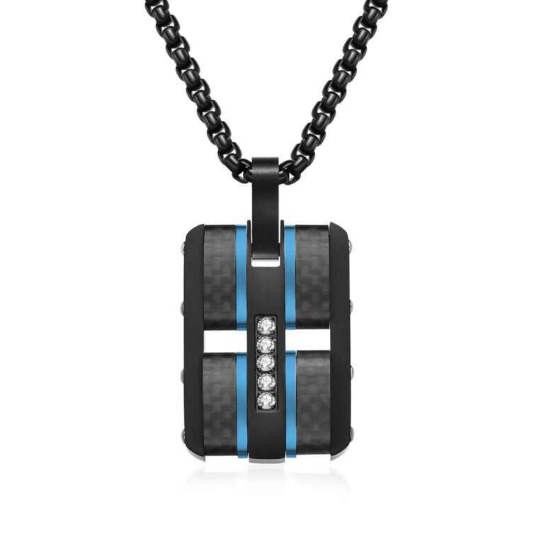 Men’s 316 Stainless steel strap design square solid carbon fiber combination pendant with CZ stones in IP Black and Blue/Gold