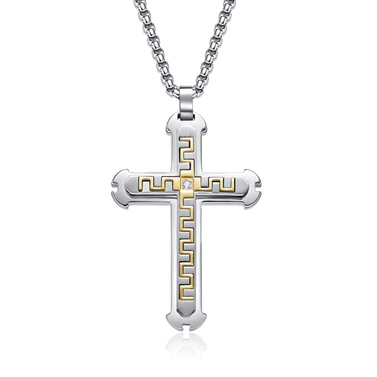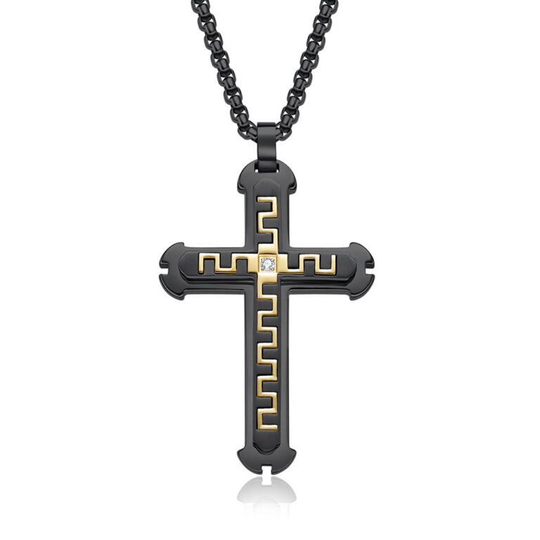 Men’s 316 Stainless steel Great Wall pattern design three-layer combination cross pendant with CZ in Steel/Black with Steel/Gold pattern colors
