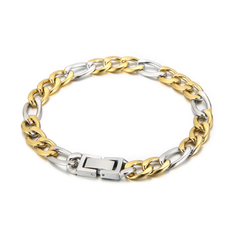 Men’s Polished Stainless Steel Figaro 3:1 Chain Bracelet in Steel/Gold colors in 8/18/20/22/24/26/28/30” lengths and 7.5/9/11mm widths