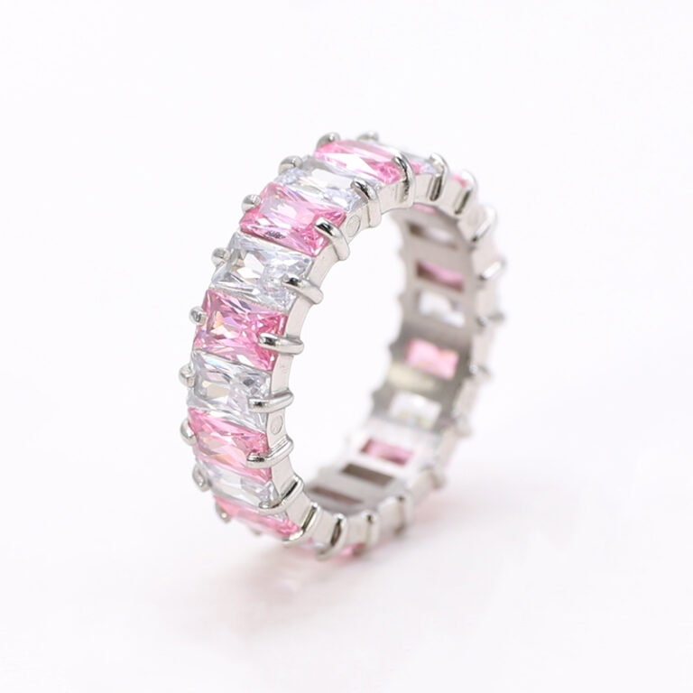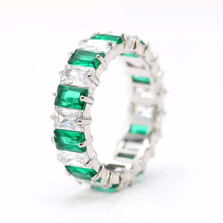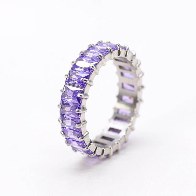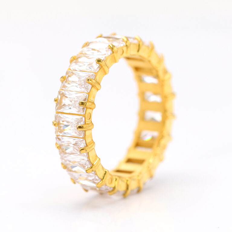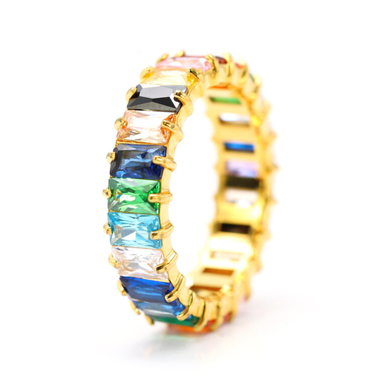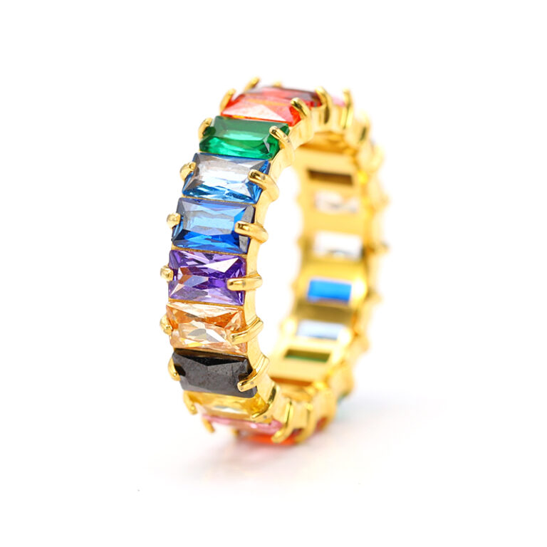 Princess Ring Size 6,7,8 or 9mm in steel or IP Plated 18K Gold as in picture with color stones Green, sea blue, and sky blue are glass and Red, white, pink, purple, yellow are zircons