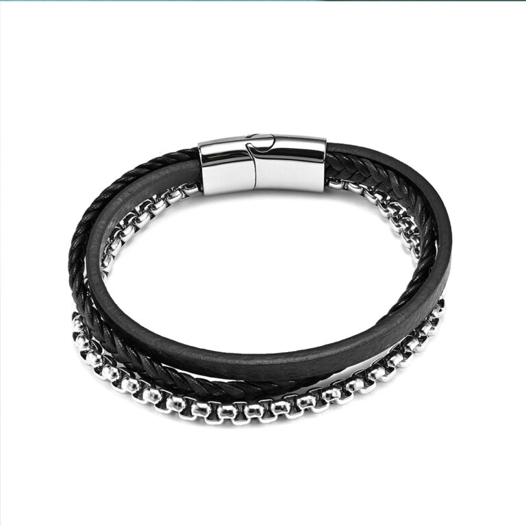 8.5” length Fashion men’s and women’s hand-woven three-layer combination accessories, stainless steel & leather bracelet
