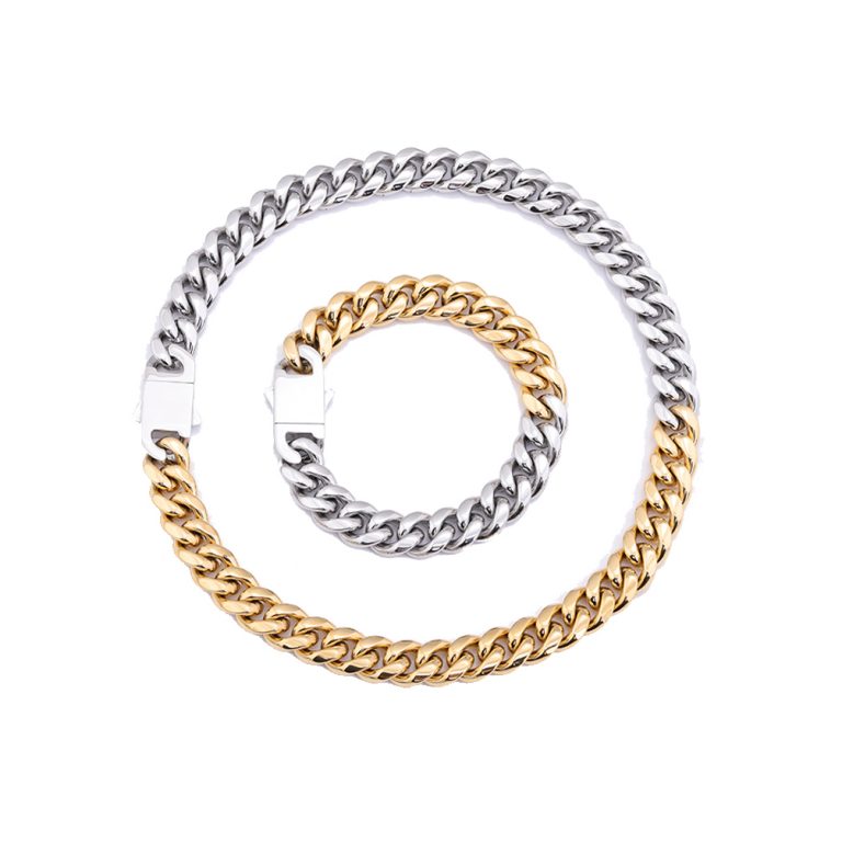 6/8/10/12/14mm width and 18/20/22/24 inches Miami Cuban Link Chain Bracelet diamond Lock Real Solid with Half 18K Gold&half steel high polishing Finish Stainless Steel, Miami Cuban Link bracelet/necklace with lock Box Clasp