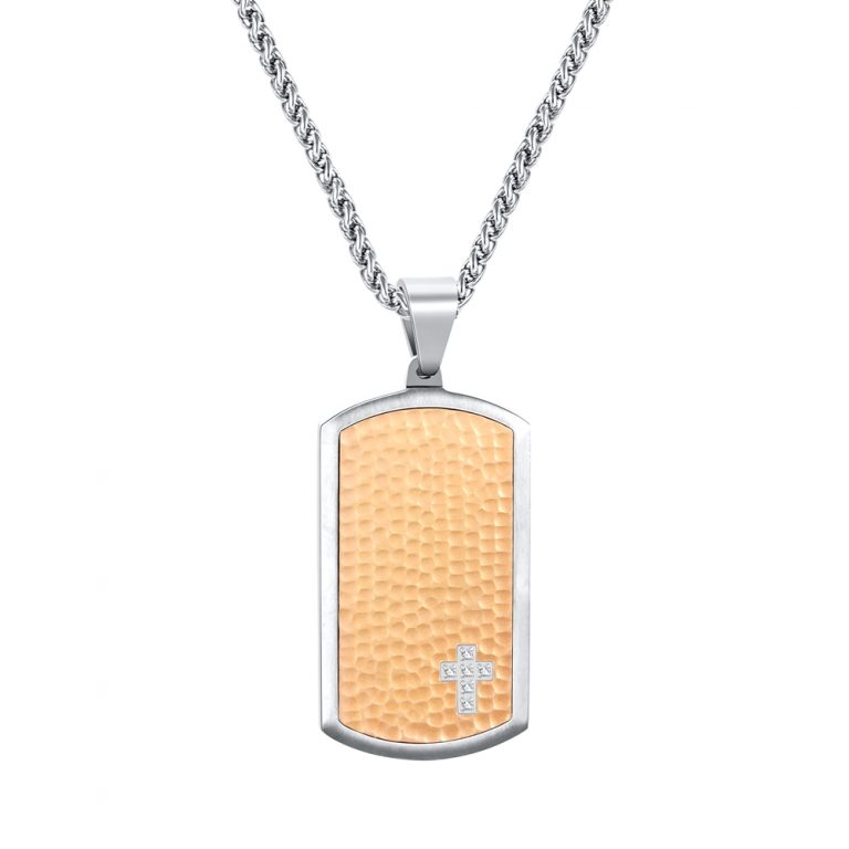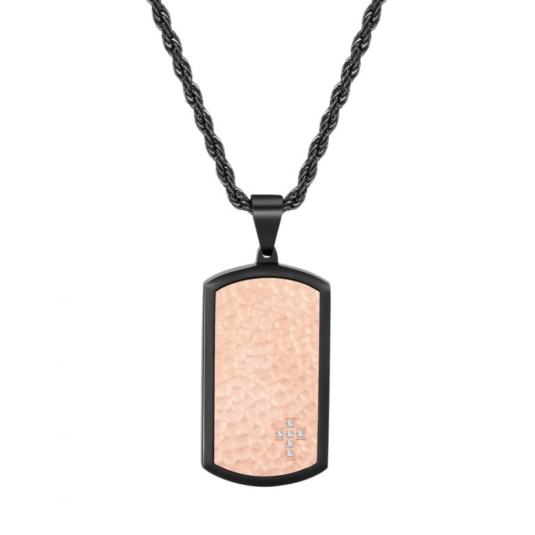 Matte Finished 316L Stainless Steel Hammered with CZ inlaid Tag and Black & Rose Gold IP
