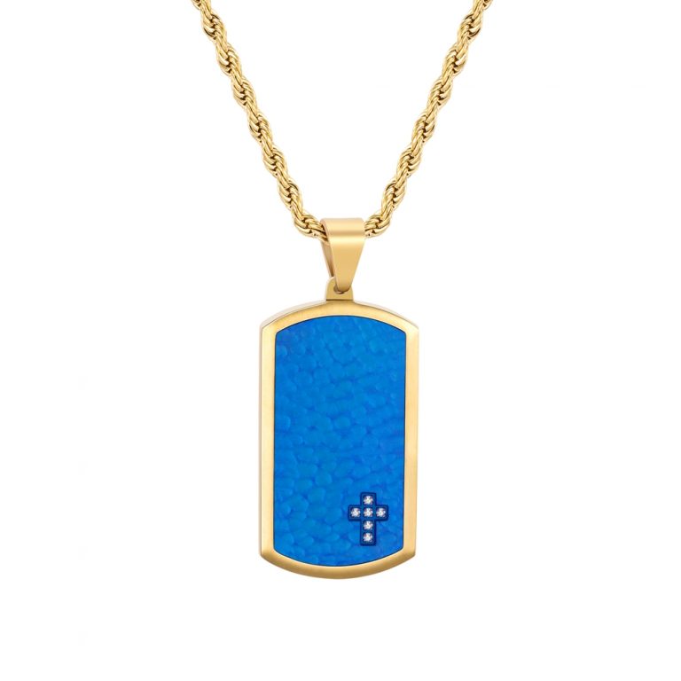 Matte Finished 316L Stainless Steel Hammered with CZ inlaid Tag and Black & Blue IP