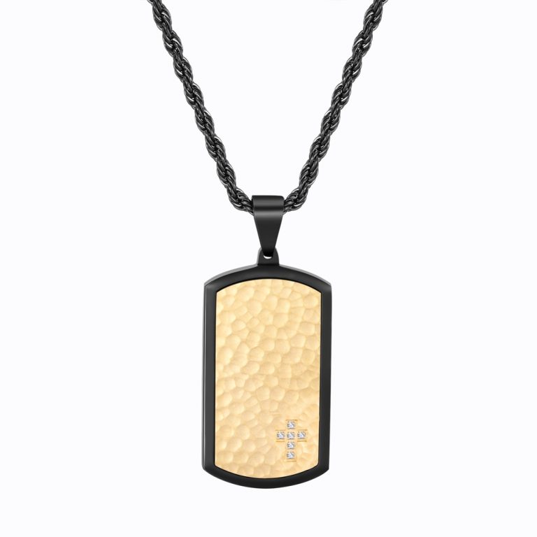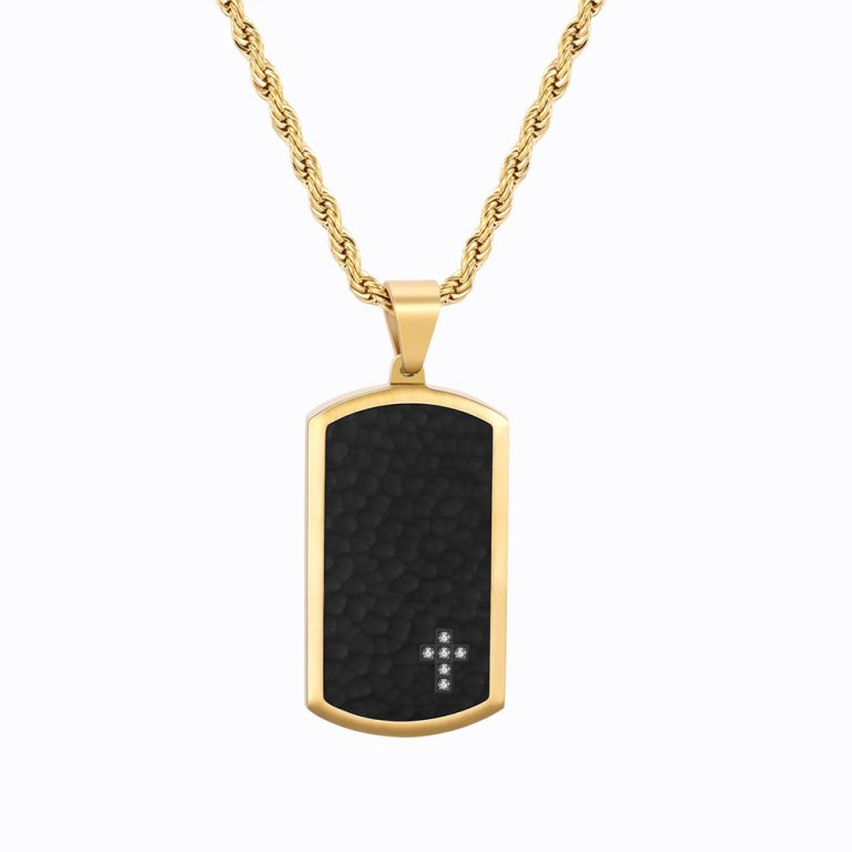 Matte Finished 316L Stainless Steel Hammered with CZ inlaid Tag and Black & Yellow Gold IP