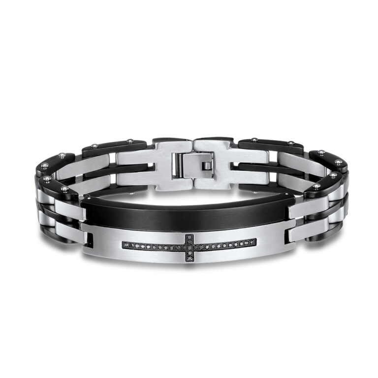 316L Stainless Steel two tone steel and black IP bracelet with black CZs in cross shape, bracelet