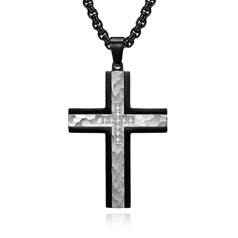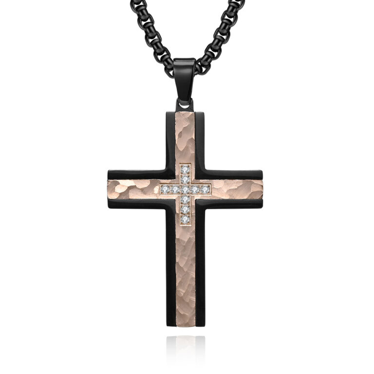 Men’s 316 Stainless steel inlaid CZ cross pendant original vintage bark pattern in IP Black and Steel/Rose Gold colors