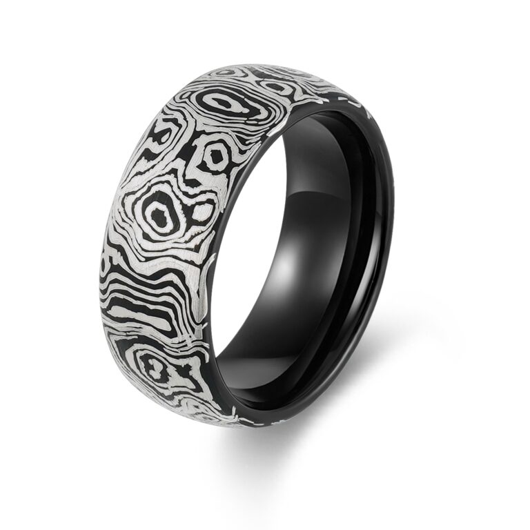 8mm-Tungsten/S.st/Titanium Polished ring with treeline pattern in IP Black