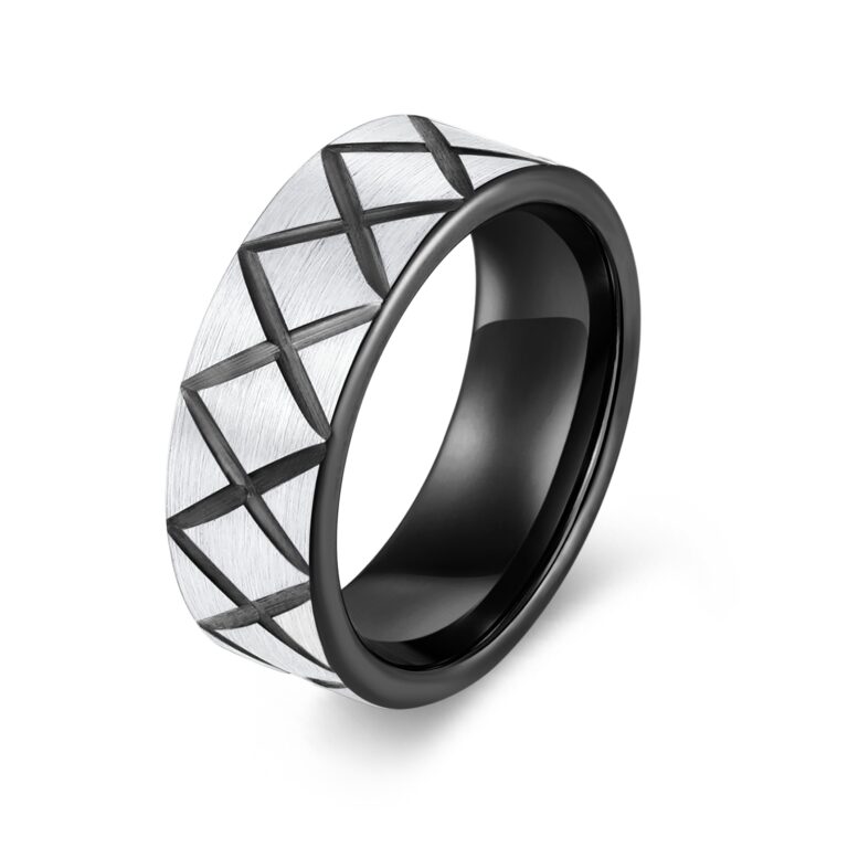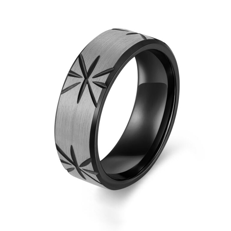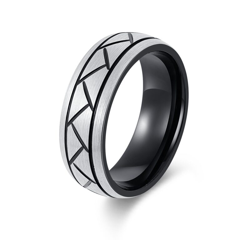 8mm-Tungsten/S.st/Titanium Brushed ring with pattern in IP Black