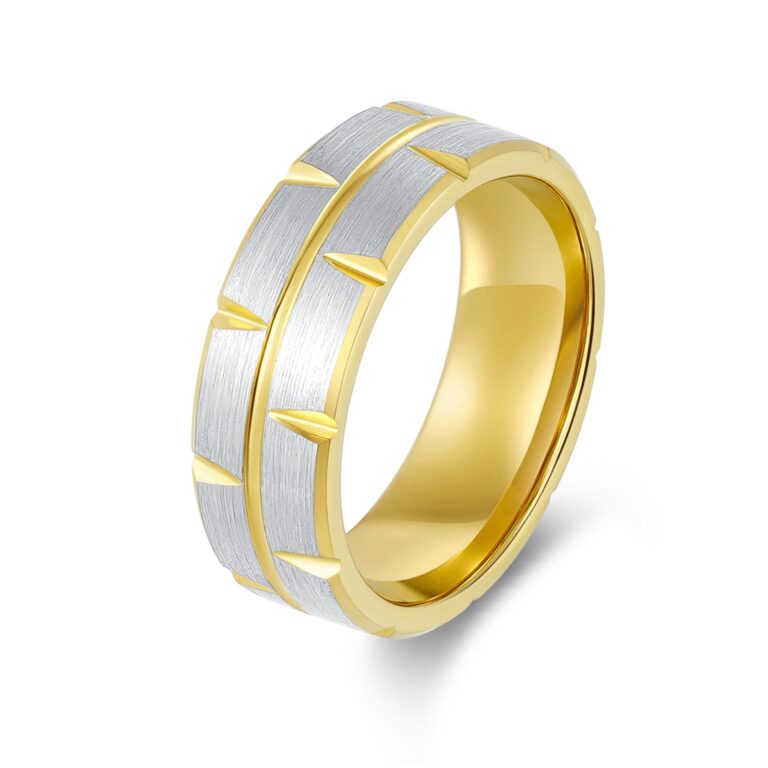 8mm-Tungsten/S.st/Titanium Brushed ring with pattern in IP Yellow Gold