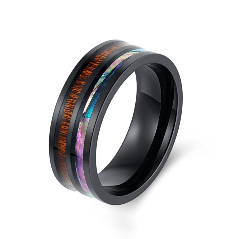 8mm-Tungsten/S.st/Titanium Polished ring with wood and shell inlays in IP Black